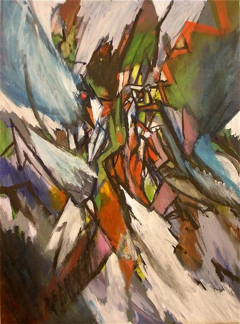 Themes of some of the paintings first viewed were figures from Greek mythology, abstract expressions of Daphne, Nike, Medusa and Cassandra, as well as Demeter and Persephone, female archetypes loaded with layers of conscious and unconscious meaning and symbolism represented in oils on canvas. The interest in female archetypes is common to many women these days in understanding women's roles and it is similar to artist Ann Stewart Anderson profiled last month. In Diane Thodos' case, it is natural also because of her Greek background. Many of these feminist subjects were done in a style which resembled chalk drawings, done with oil on canvas, but also using a paint stick Diane explained.